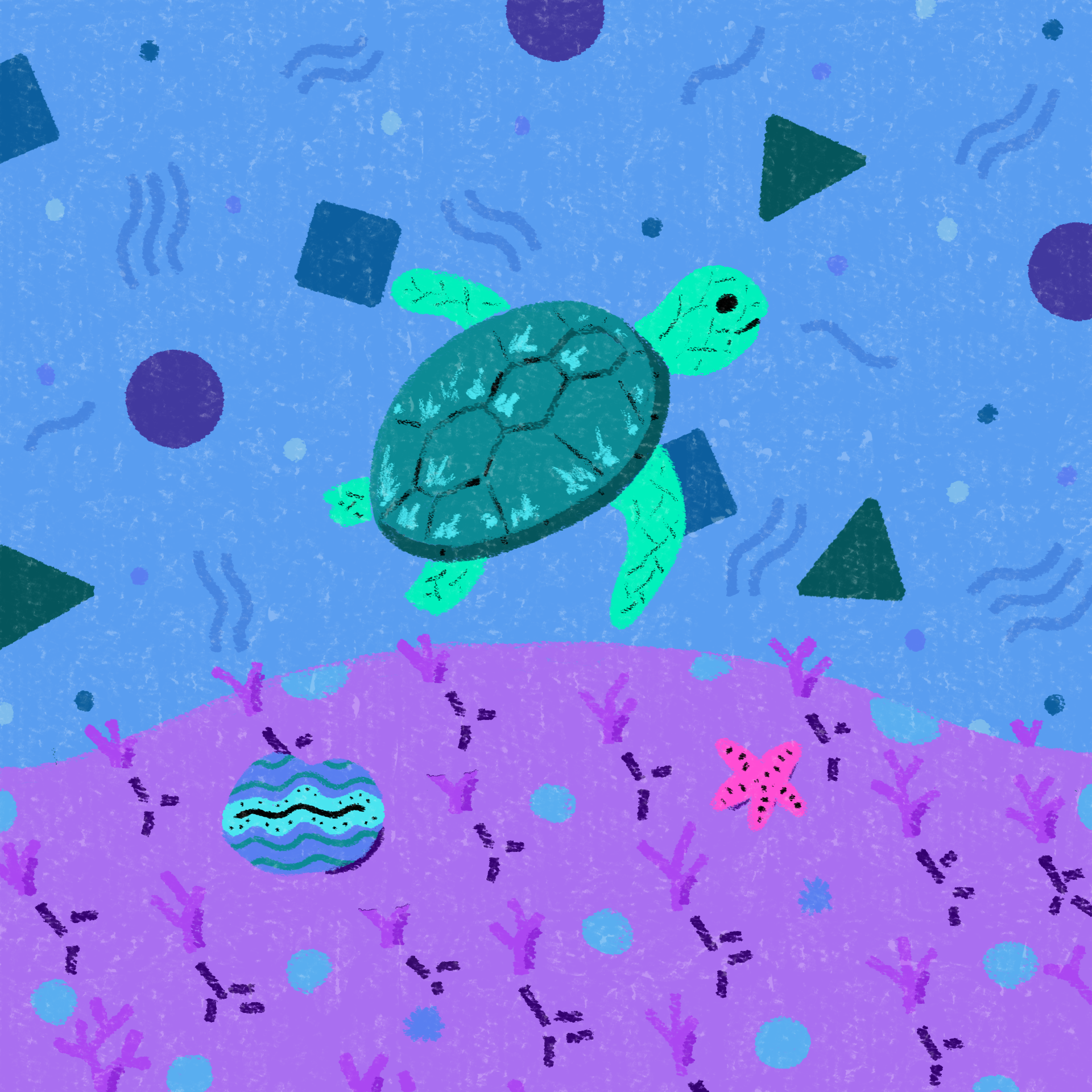 I used Adobe After Effects to set up the sequence and animate the turtle and plastic bottle, using the graph editor to creating more natural looking movement. Then, I used Adobe Animate to create the frame-by-frame animation for the transition. This included drawing each stage of the abstract objects as they morph into the plastic bottle at a rate of every two frames.