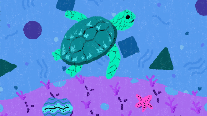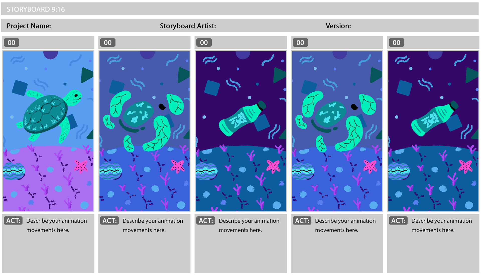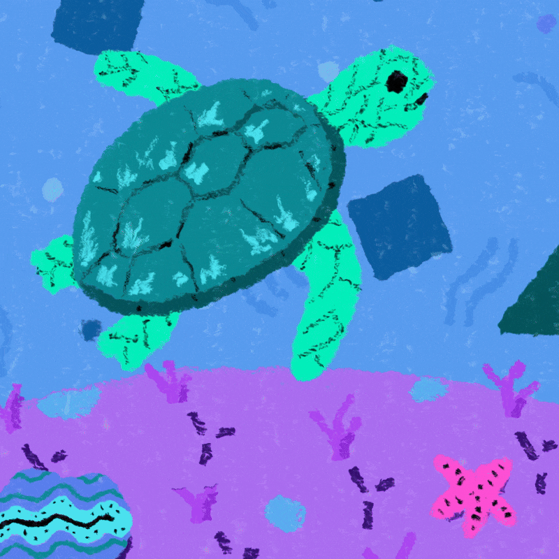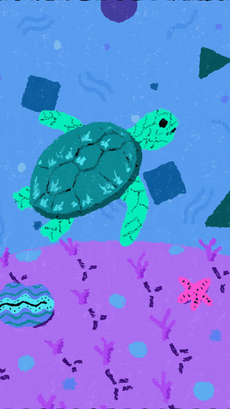 I created a storyboard to plan out the animation sequence. This helped me define the key moments: the turtle, the transformation, the plastic bottler, and reverse sequence to close the loop. Then, I created style frames to provide a more refined representation of the final visual aesthetic.
