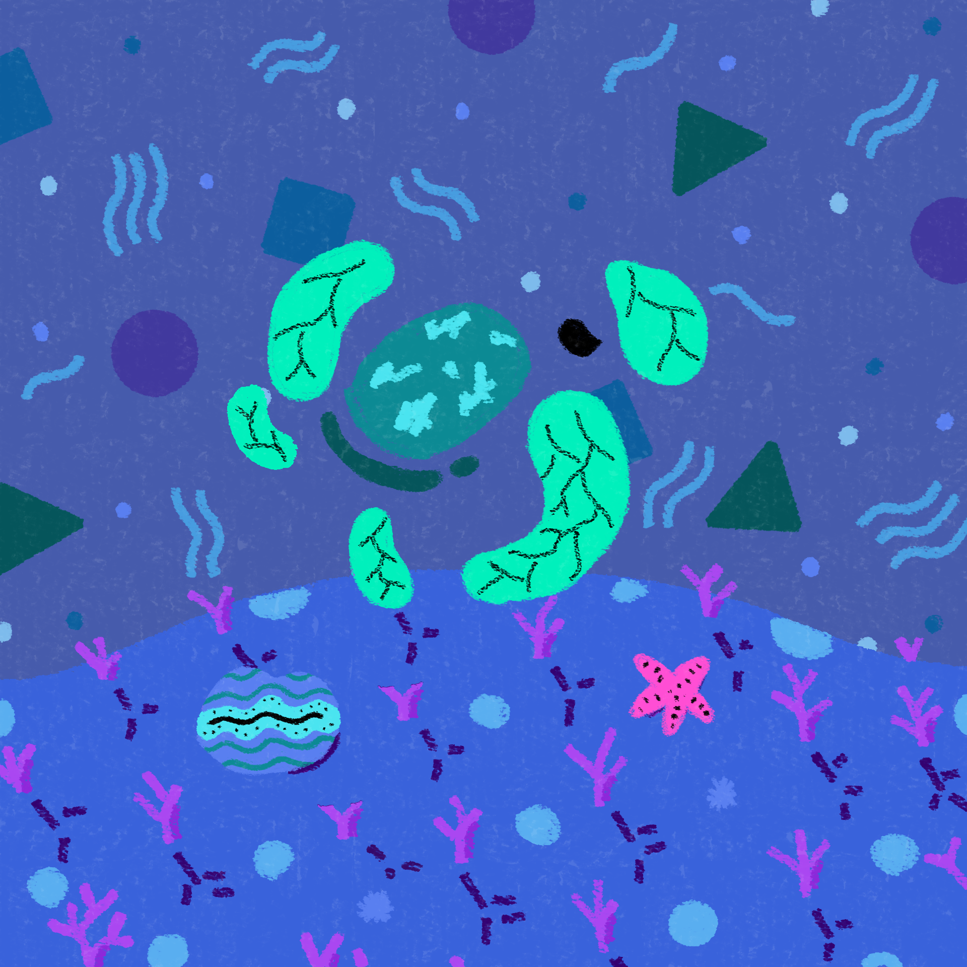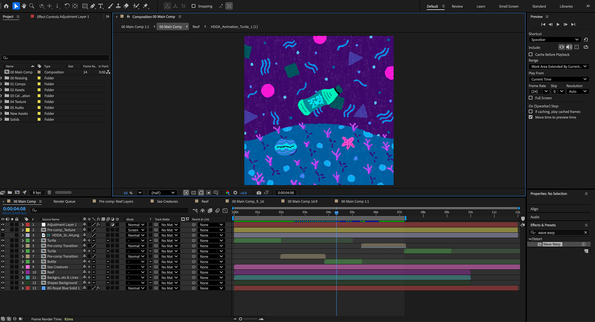 Finally, I brought the Animate files into After Effects, and applied several visual effects to give the illustration an underwater feel and match movement to the hand-drawn visual style. Finally, I rendered the project in different sizes and formats to suit various social media platforms.