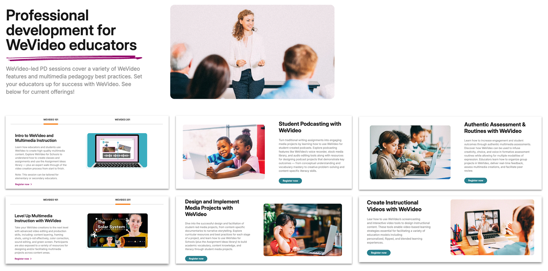 I designed and launched WeVideo's instructor-led professional development program to onboard and train users on the product and relevant use cases. I created six turnkey workshops, served as the lead facilitator, and trained a team of customer success managers in order to scale the program.